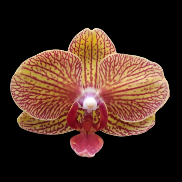 Com pétalas amarelas radiantes marcadas por veios vermelhos intensos, a Phalaenopsis 528 impressiona pela harmonia entre cor e padrão. Seu visual rajado remete a obras de arte naturais, enquanto o labelo vermelho com toques de branco reforça o contraste e atrai todos os olhares.